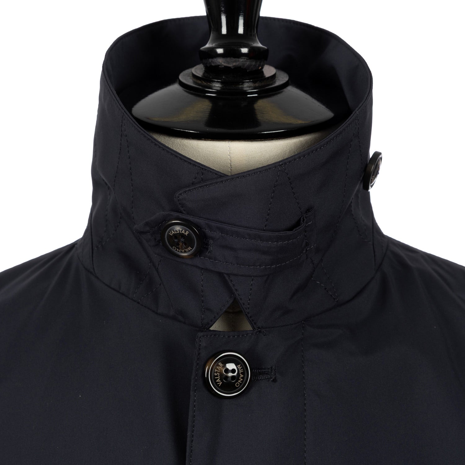 - Dished collar with buttoned wind deflector
