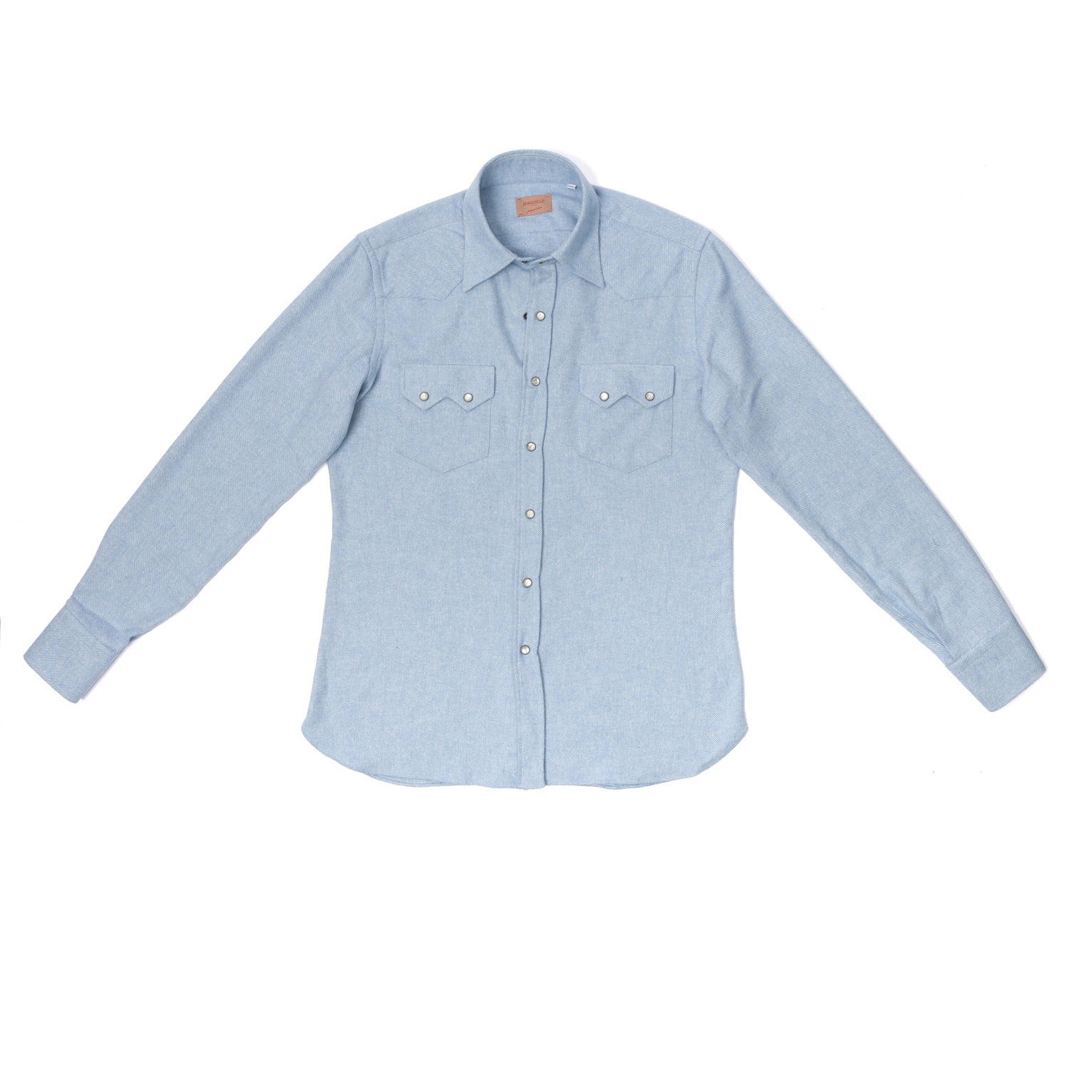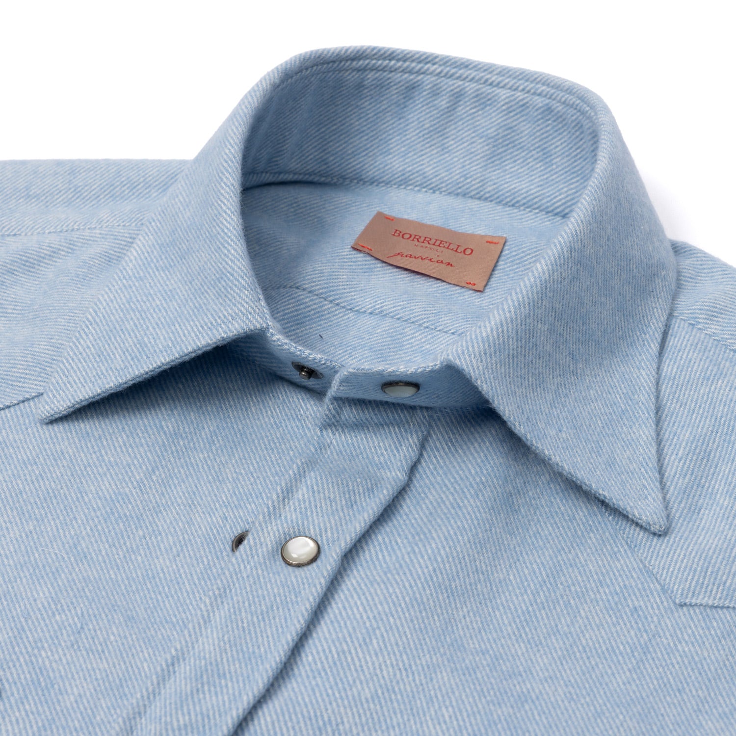 The soft washed cotton flannel, combined with the super soft "Clint" collar and the typical press studs with mother-of-pearl inlet, make this shirt a specialty from the Borriello shirt manufactory and an important icon of your wardrobe for autumn and winter.
