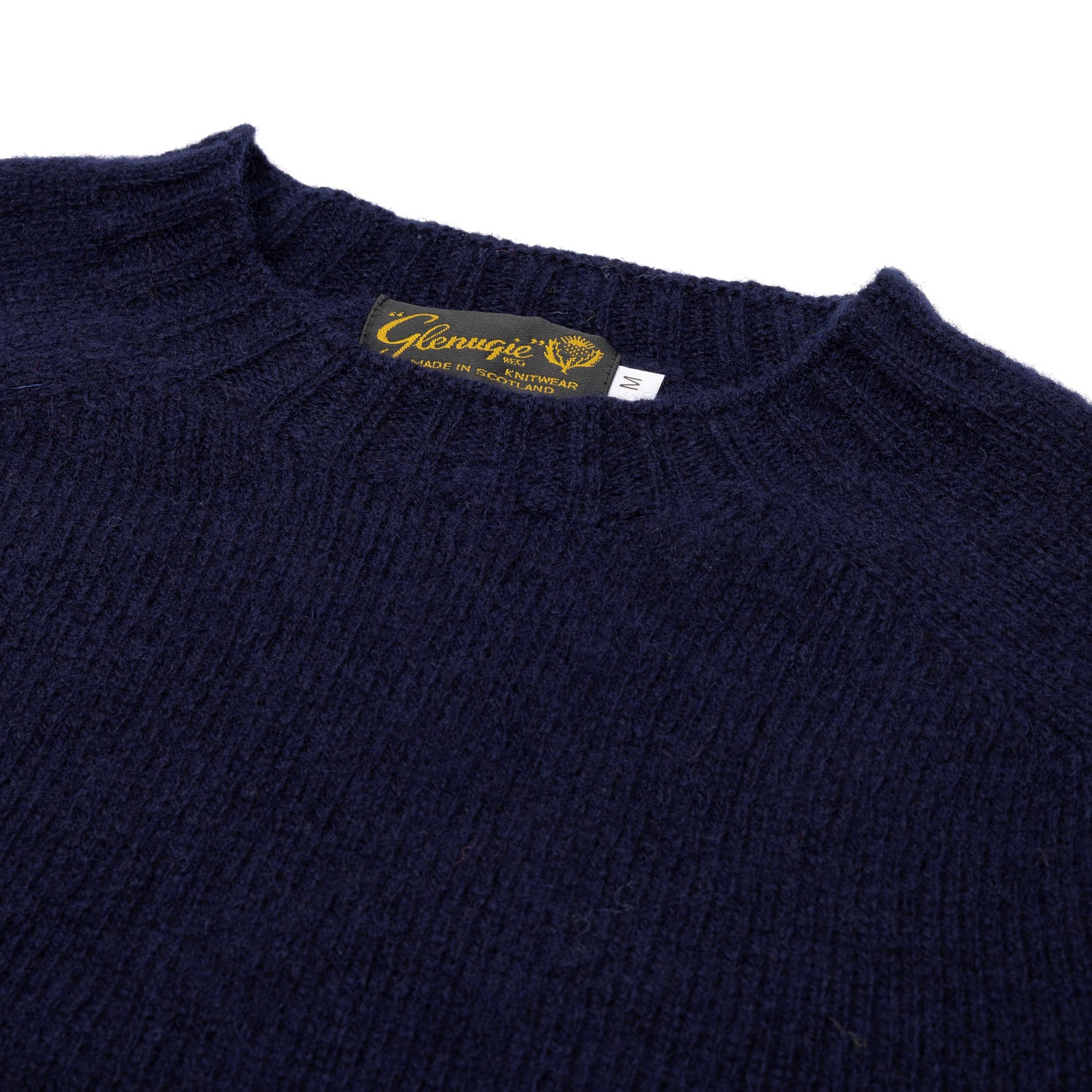 Glenugie's tiny knitting mill specializes in knitting Shetland knitwear. The yarns are washed with sea water in the special climate of Aberdeen's hinterland before knitting, giving them an unusually soft feel for Shetland sweaters. A very special specialty of Glenugie, which gets its subtly sporty stitch pattern "Flat Knit" by knitting on the particularly old circular knitting machines.