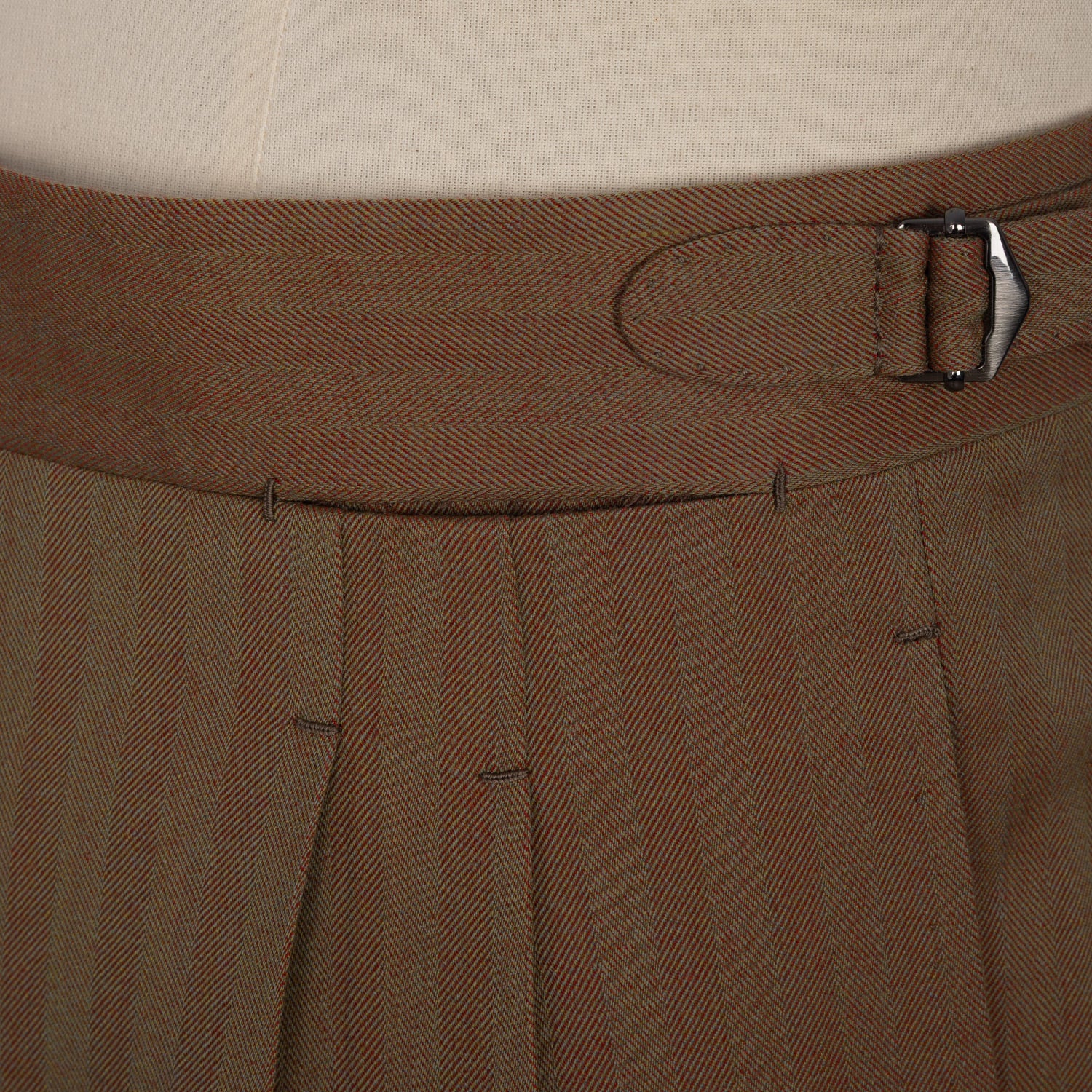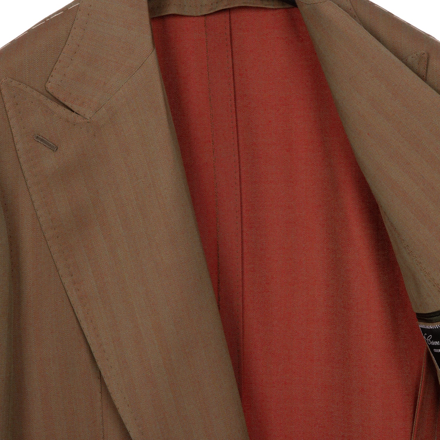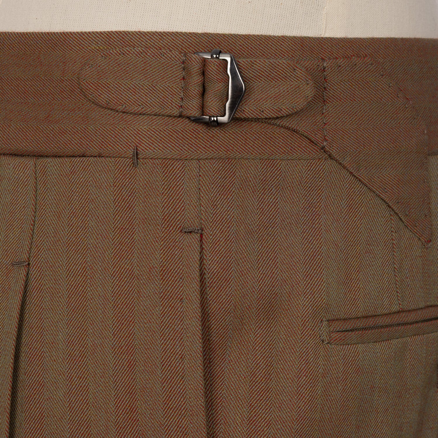 The fabric, with its herringbone pattern and typical red-brown shimmering color, was created in the English weaving mill of Standeven. Historically valuable cloths have been woven there since 1885.
