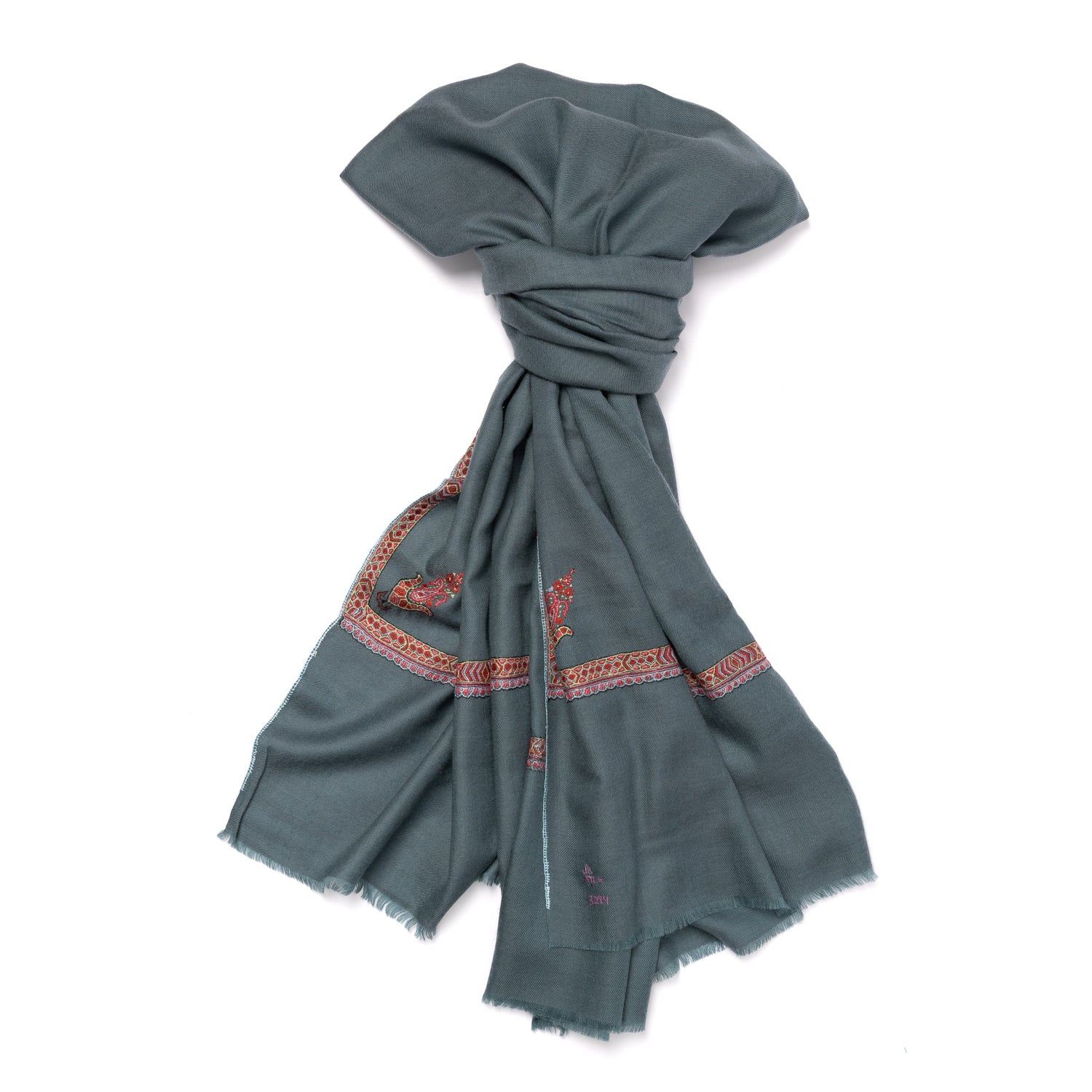 In historischer Tradition wird auf hölzernen Handwebstühlen gewoben und es wird von Hand bestickt. Das Weben obliegt in indischer Tradition den Frauen und die Männerhände besticken diese wundervollen Kunstwerke. Vom Auskämmen der Kaschmirwolle, bis zum fertigen Schal dauert es, ganz nach Größe,  bis zu 9 Monate. Nach der Fertigstellung sticken die Handwerker ihre Initialen am Schalende ein und jeder Schal wird durch diesen gesamten Verlauf zu einem luxuriösen Unikat.
